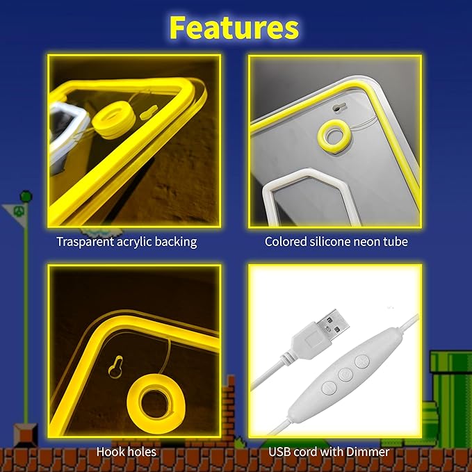 SOBRE ESTE LETRERO DE QUESTION MARK DE MARIO: Tiene base de acrílico transparente, tiras LED tipo neón y cubierta de silicona de color. Incluye cable USB de 2 metros con interruptor perfecto para decoración de pared en cualquier habitación.