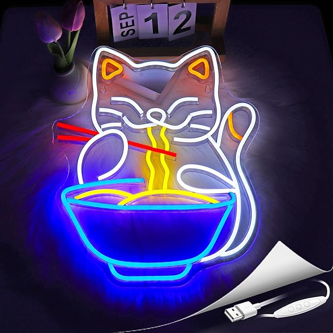 SOBRE ESTE LETRERO DE RAMEN CAT: Tiene base de acrílico transparente, tiras LED tipo neón y cubierta de silicona de color. Incluye cable USB de 2 metros con interruptor perfecto para decoración de pared en cualquier habitación.