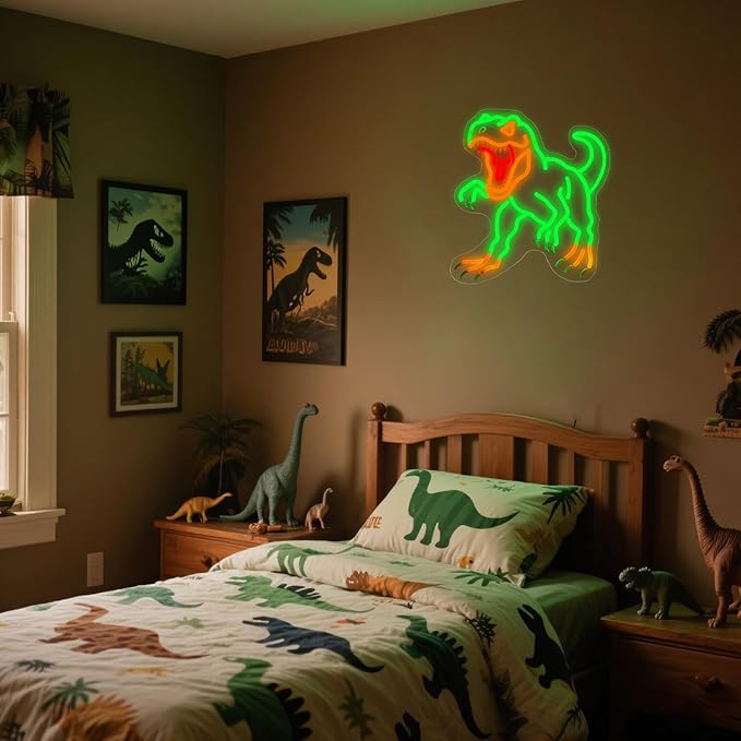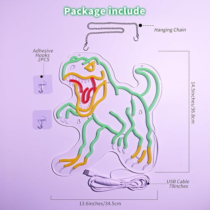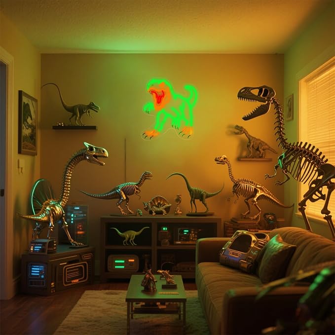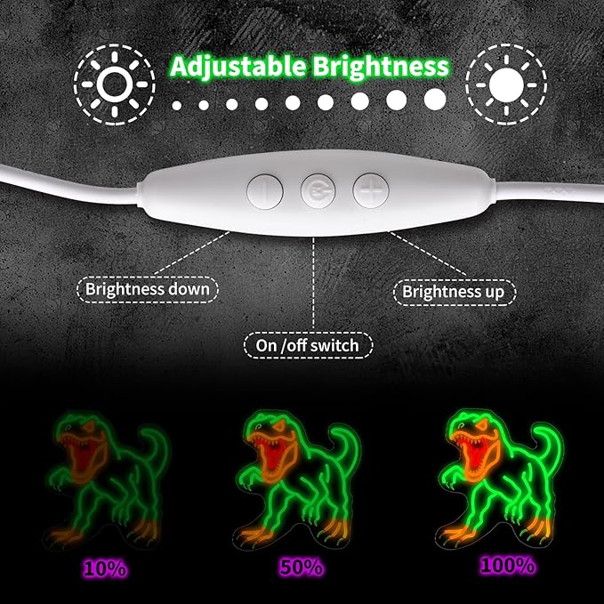 SOBRE ESTE LETRERO DE T-REX : Tiene base de acrílico transparente, tiras LED tipo neón y cubierta de silicona de color. Incluye cable USB de 2 metros con interruptor perfecto para decoración de pared en cualquier habitación.